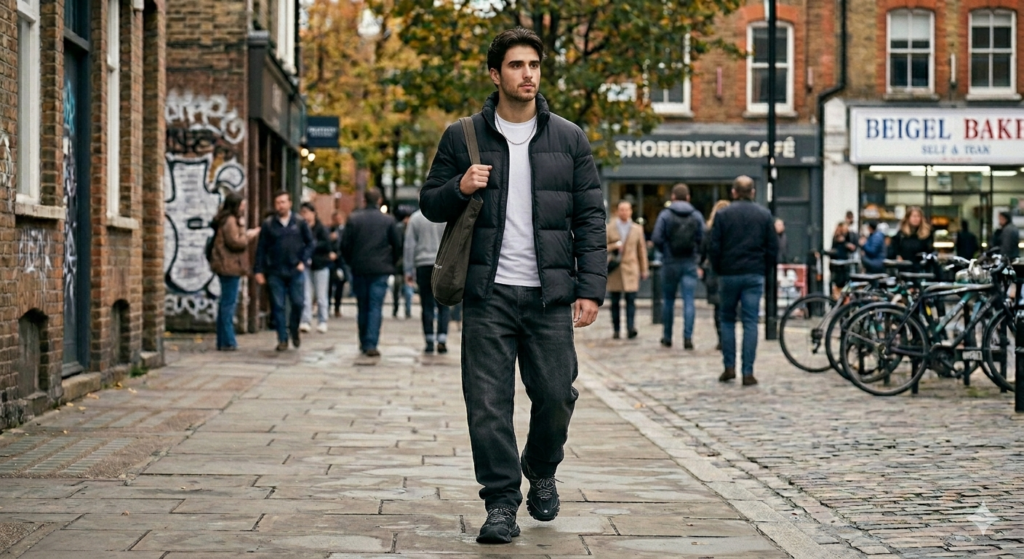 The Outfit: Black or dark wash baggy jeans + slim or tailored-fit puffer jacket (not oversized — this balance matters) + plain fitted tee + chunky technical or leather trainers