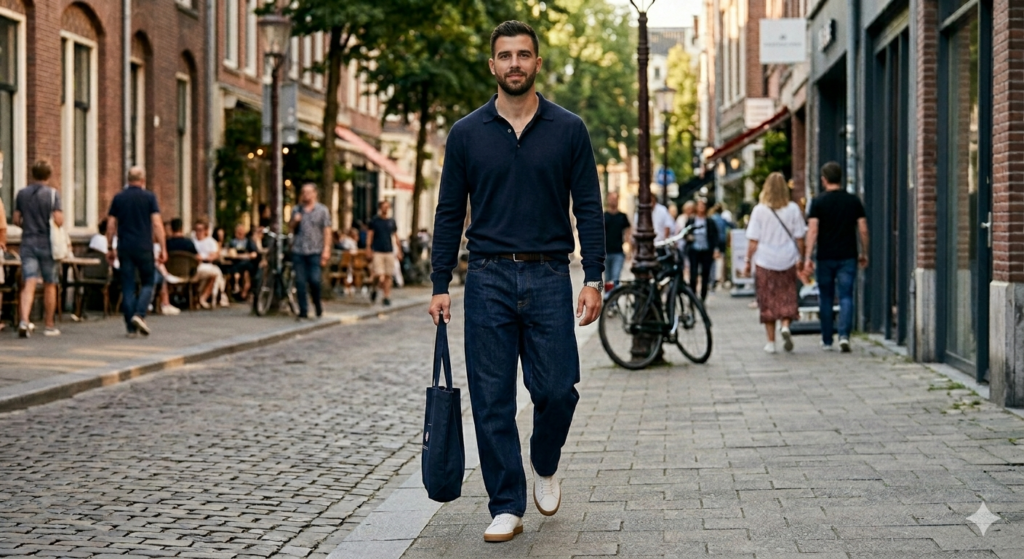 The knit polo is one of the best upper-body pairings for baggy jeans because it adds texture and visual interest without adding volume. It sits between a tee and a shirt in terms of dressing register, which gives the baggy jeans a slightly elevated context while keeping everything firmly in comfortable, casual territory.