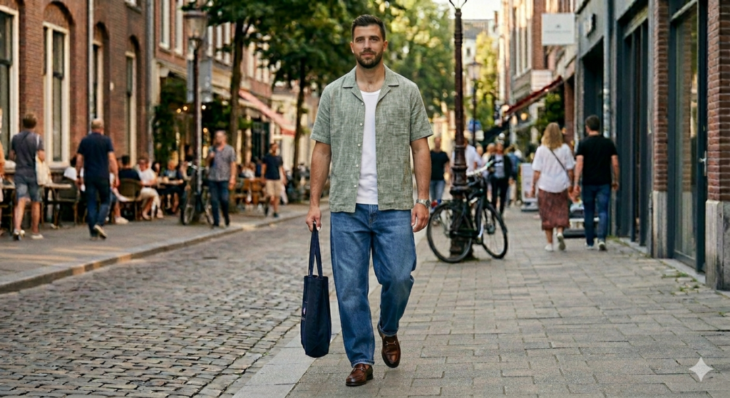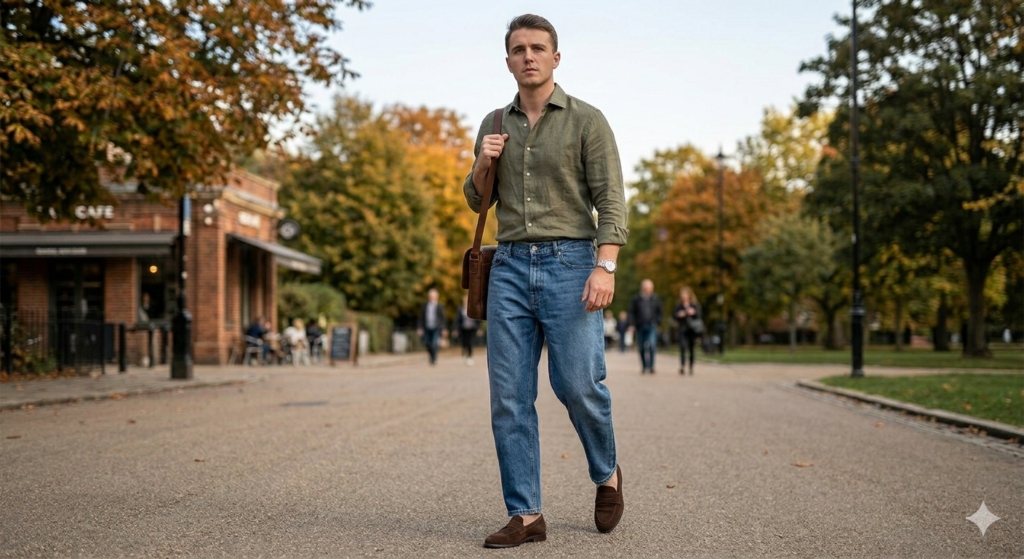 The Outfit: Dark or medium wash straight baggy jeans + linen long-sleeve shirt (tucked fully or with a clean half-tuck) + leather or suede loafers (no socks or no-show socks)
