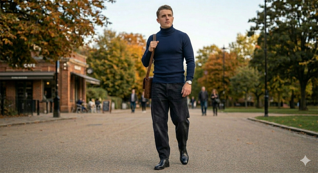 This is the baggy jeans outfit that challenges every assumption about what relaxed denim can do. A slim rollneck — fitted, clean, and architectural — paired with dark baggy jeans and Chelsea boots creates a look that reads as genuinely sophisticated. The slim turtleneck’s clean neckline against the wider denim silhouette below creates a visual contrast that looks cinematic and intentional.