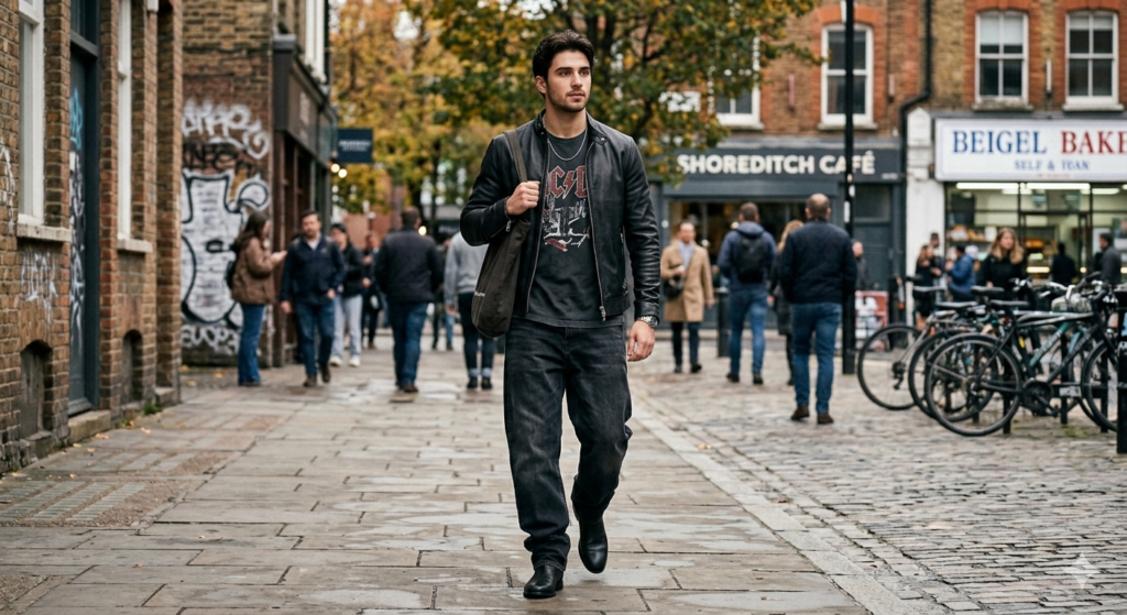 The Outfit: Dark or black wash baggy jeans + vintage or washed graphic tee (fitted, not oversized) + slim leather jacket (black or dark brown) + leather boots or low-profile trainers