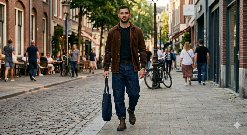 The Outfit: Dark wash baggy jeans + cord or corduroy overshirt (worn open or loosely buttoned) + fitted tee underneath + chunky leather lace-up boots or Chelsea boots