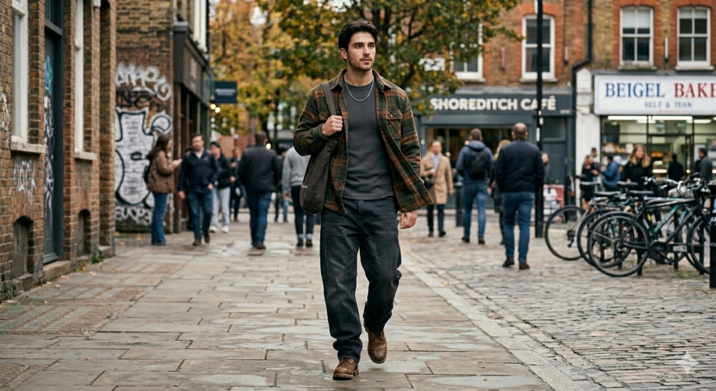 The Outfit: Dark wash baggy jeans + heavyweight flannel overshirt (worn open, in plaid or solid earthy tone) + slim fitted thermal long-sleeve tee + leather boots or chunky trainers