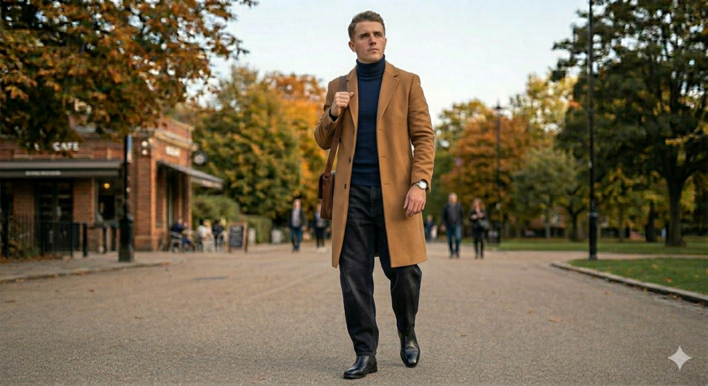 A long wool overcoat transforms baggy jeans in the same way it transforms every outfit — it adds length, weight, and sophistication that carries everything beneath it into elevated territory. Dark baggy jeans under a camel overcoat with a slim knit crewneck and Chelsea boots is one of the season’s most compelling casual looks.