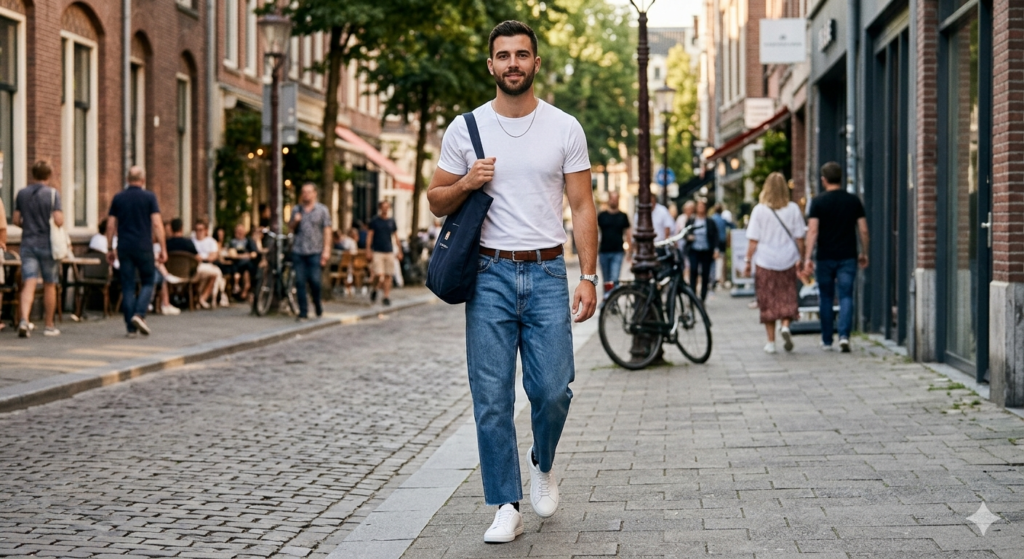 The Outfit: Medium or dark wash baggy straight jeans + premium fitted white crew-neck tee (tucked slightly at the front) + clean white leather sneakers