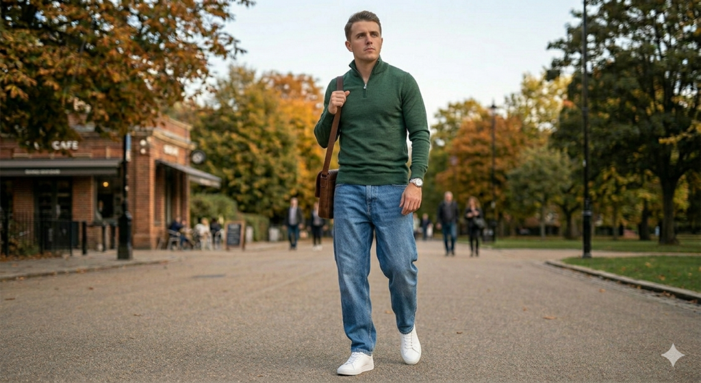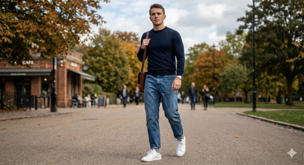 The Outfit: Dark or medium wash baggy straight jeans + slim-fit merino or cotton crewneck (fitted through the chest and shoulders) + clean white or neutral leather trainers
