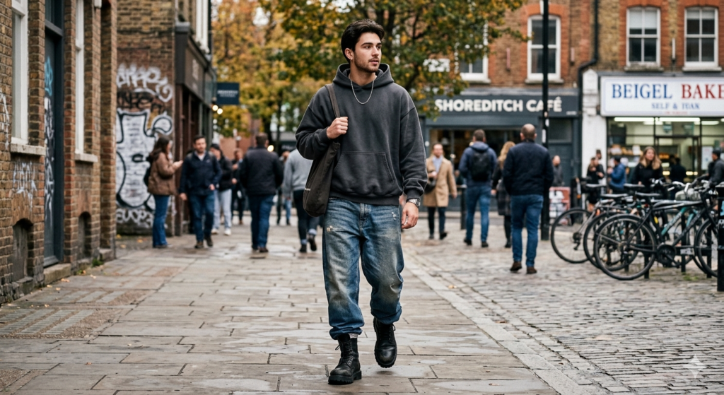 The Outfit: Light or medium wash baggy jeans + oversized heavyweight hoodie (in grey, black, or navy) + chunky leather or lug-sole boots