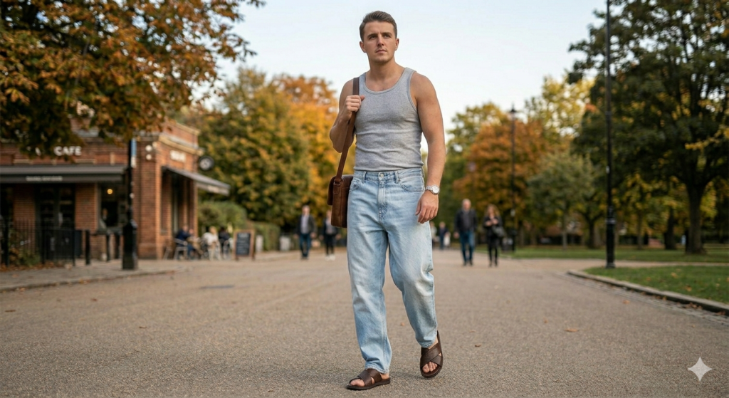 The Outfit: Light or medium wash baggy jeans + fitted ribbed or plain tank top (white, grey, or black) + leather or structured slides