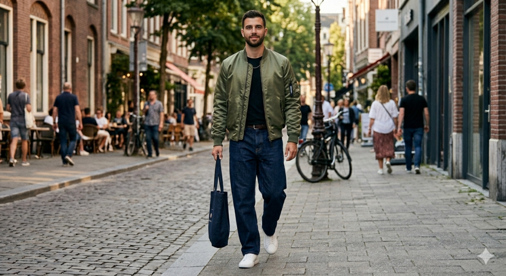 The bomber jacket is one of the strongest outerwear choices for baggy jeans because it naturally balances their volume. The bomber’s ribbed hem sits at the hip and creates a strong visual break between the fitted-ish upper half and the wider lower half — which is exactly the proportional relationship that makes baggy jeans work well.