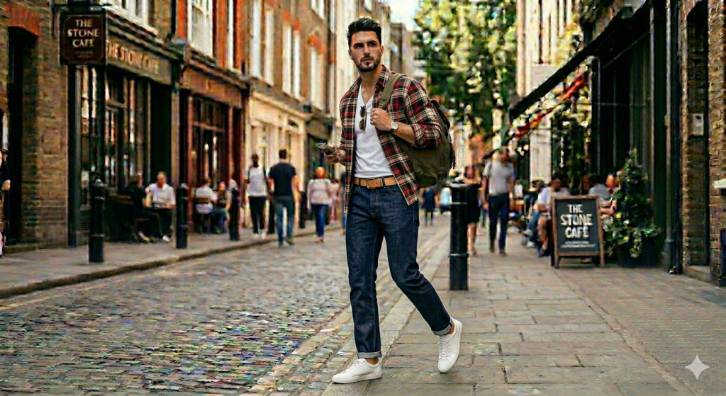 The Outfit: Flannel or heavy cotton overshirt (open, worn as a jacket) + white fitted tee + straight-cut raw denim + white sneakers