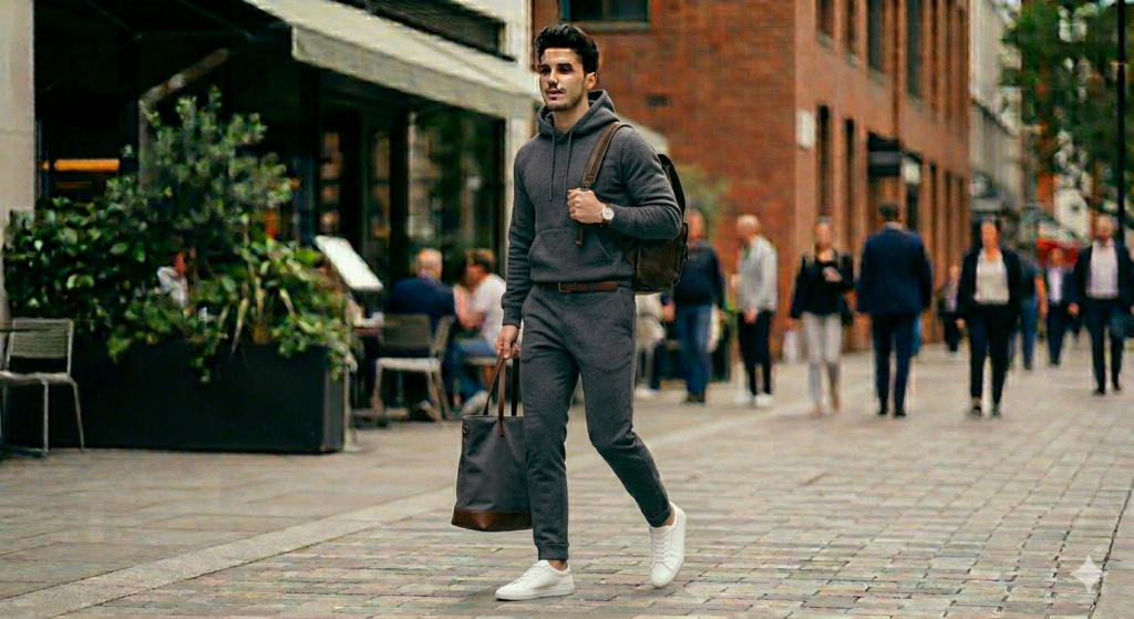 The Outfit: Premium sweatpants (fitted, not baggy) + heavyweight hoodie + clean white or grey trainers + structured tote or crossbody bag