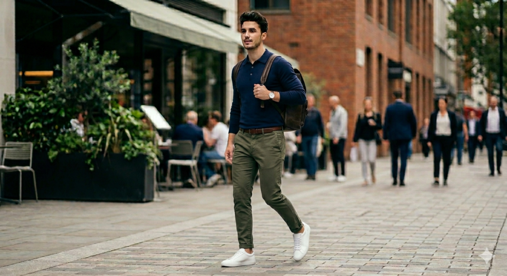 The Outfit: Navy or olive slim-cut chinos + fitted cotton polo (tucked) + loafers or clean white runners