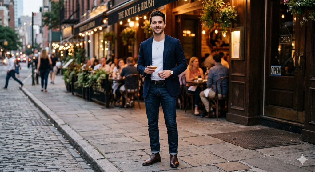 This is the most reliable date night outfit in men’s fashion, and it has been for decades. The reason it keeps working is the balance it strikes: the jeans and tee say relaxed and approachable; the blazer says you made an effort. Together, they hit exactly the right note for the vast majority of date scenarios.