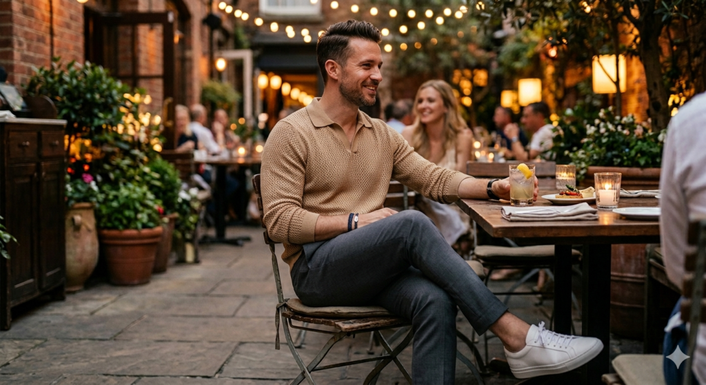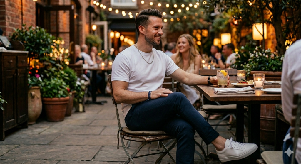First dates carry their own logic. Dressing too formally can create pressure; dressing too casually suggests you didn’t care. A quality tee, dark chinos, and clean leather trainers solves this perfectly — it says you made a clear effort without making the outfit the subject of the evening.