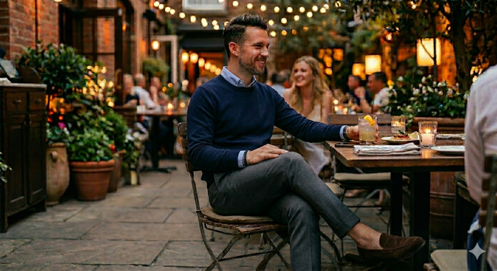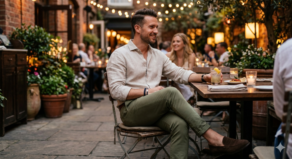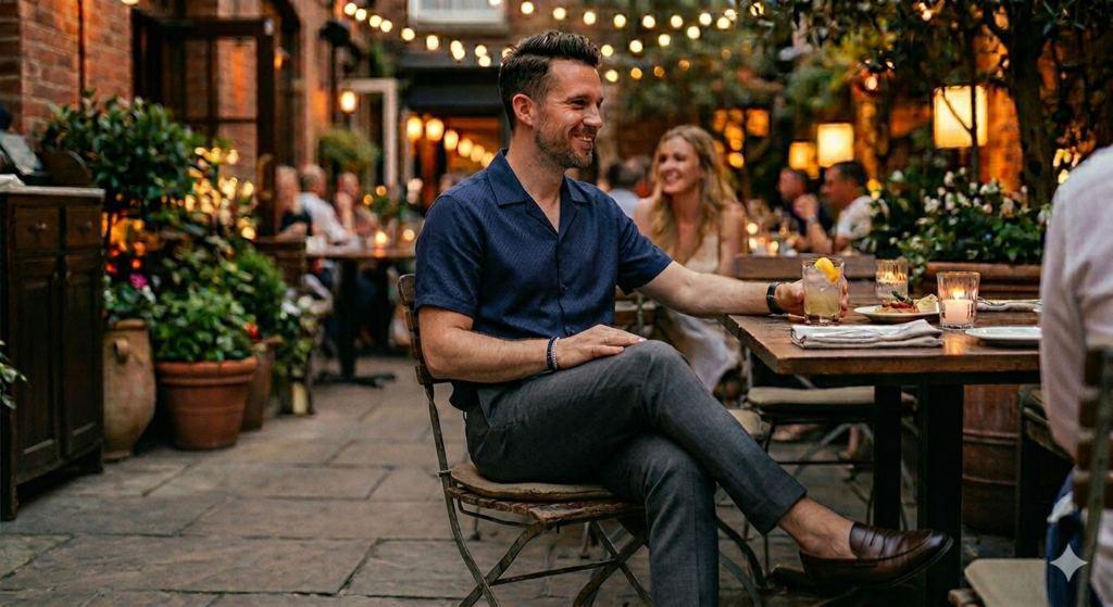 Q: Should men dress up or keep it casual for a date? The answer depends entirely on the venue, the date stage, and your personal style. A hard-and-fast rule of thumb: be slightly more dressed than you would be for that venue on an average day. If you’d normally wear shorts and a tee to that bar, wear chinos and a clean shirt instead. If you’d normally wear jeans, add a blazer. The goal is visible effort — enough to communicate that this occasion matters to you, not so much that you look like a different person to who you are day to day.
