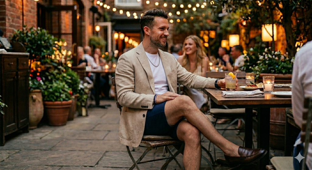 Summer date nights present a real challenge: it’s too hot for trousers, but shorts can feel underdressed. This outfit solves it. The linen or seersucker blazer over a plain tee and tailored shorts is a genuinely clever combination — it provides structure and intention up top while keeping the bottom half comfortable and seasonally appropriate.