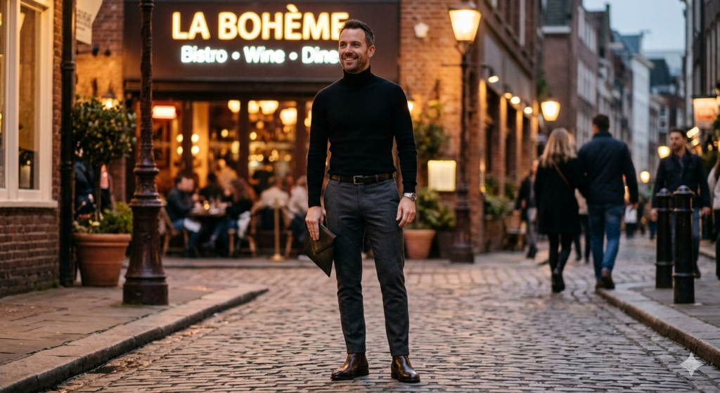 Q: How should men dress for a dinner date? A dinner date depends heavily on the restaurant’s register. For a mid-range casual restaurant, outfits 1, 5, or 12 hit the right note. For a smarter, more elevated restaurant, outfit 2 (turtleneck and tailored trousers) or outfit 8 in winter (roll-neck and wool coat) are genuinely impressive. The consistent principles: wear trousers rather than jeans where possible, ensure your shoes are polished and appropriate, and keep accessories clean and minimal. Avoid overly casual footwear — trainers at a nice dinner always look like a missed opportunity.