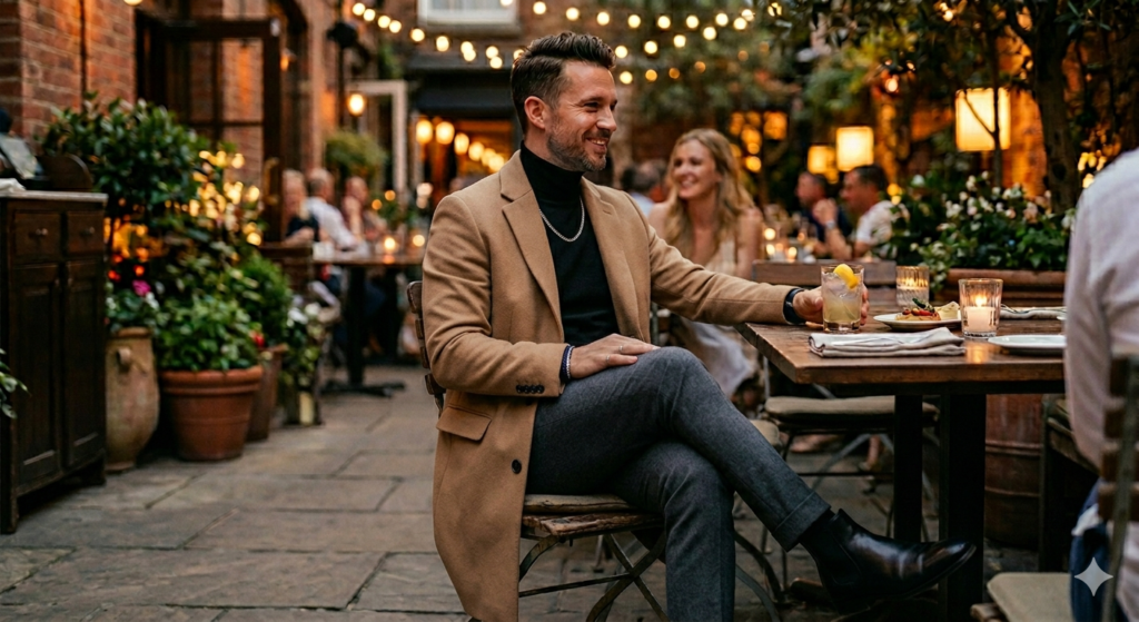 Winter dating has a natural advantage: the clothing is inherently more dramatic. A long wool coat, a slim turtleneck, and Chelsea boots in the cold is one of the most compelling silhouettes in men’s casual-smart dressing. It photographs brilliantly and looks like genuine effort with very little of it required.
