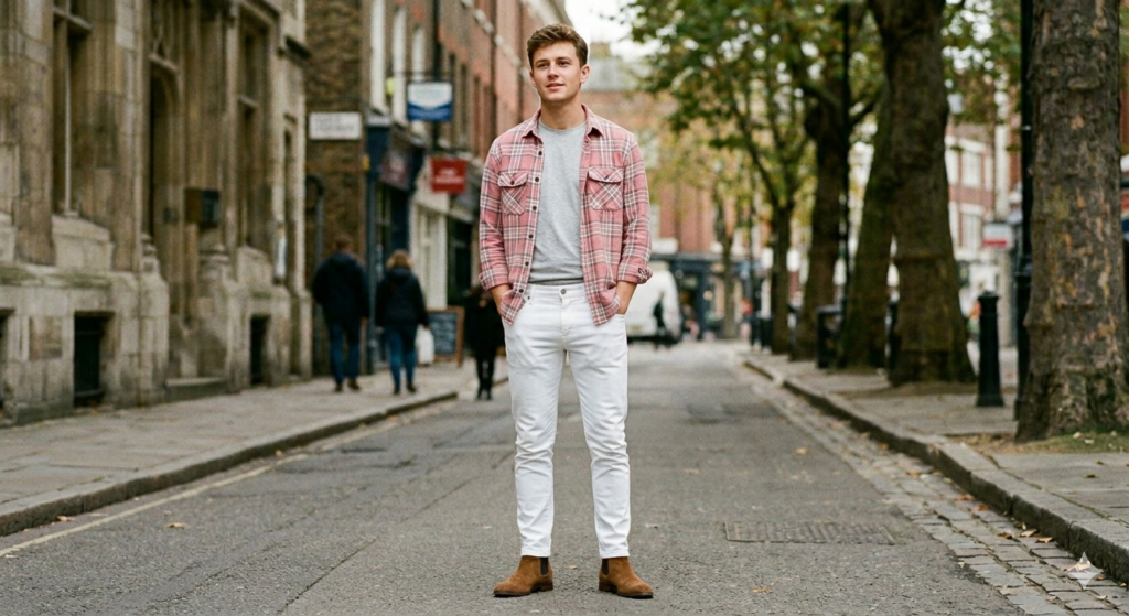 Light wash and flannel. White or off-white slim jeans with a rich-toned flannel shirt — burgundy, forest green, camel — creates a vivid contrast that leans into spring and summer styling. Chelsea boots (in black or tan) keep the look grounded rather than beachy. The white jean reflects the light tones often found in the check pattern itself, creating a cohesive palette that doesn’t feel forced.
