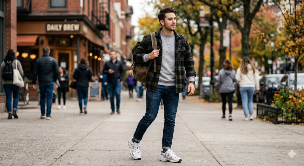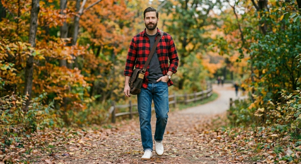 The simple weekend uniform. A medium-weight flannel shirt worn buttoned-up or half-open over straight-leg jeans, simple sneakers, and a small crossbody or shoulder bag is the kind of outfit that looks like you made an effort without overcomplicating things. It’s functional, relaxed, and completely replicable across different flannels and jeans combinations. This is the foundation look you’ll return to every weekend.