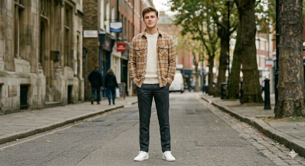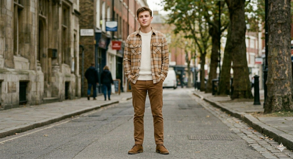 Autumnal tonal dressing. This is texture-led, tonal dressing at its warmest. A tan or camel flannel shirt worn open over a cream or oatmeal knit sweater, with brown corduroy trousers and suede desert boots, creates a look built entirely from warm, earthy tones and natural textures. There’s no single statement piece — just a cohesive assembly of complementary fabrics that photograph brilliantly in autumn light.