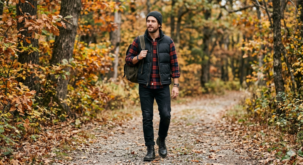 The layered outdoorsman. Wearing a flannel beneath a puffer vest is a cold-weather combination that looks genuinely considered. The flannel provides mid-layer warmth and texture; the vest adds structure at the torso and modern outdoor aesthetic. Slim black jeans and black lace-up boots keep the lower half clean. Choose a flannel in olive, tan, or rust for the strongest outdoorsy palette.