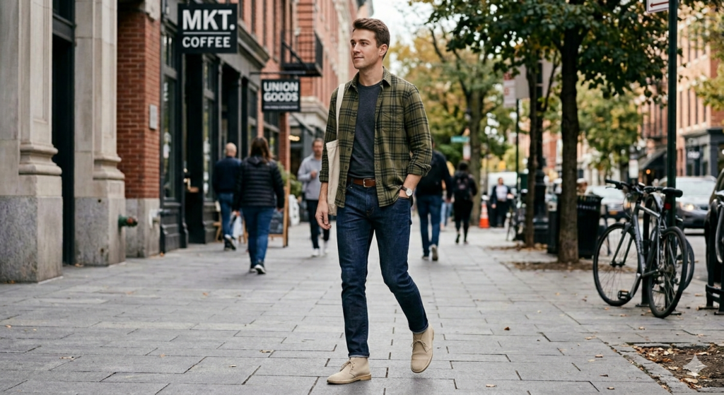 Minimal workwear casual. An olive or army green flannel shirt worn open over a white or grey tee, slim dark jeans, tan desert boots, and a canvas or waxed tote bag creates a low-key, workwear-adjacent casual look with real visual coherence. Everything sits in the same earthy, utilitarian register and the result is an outfit that feels like a considered uniform rather than a random assembly.