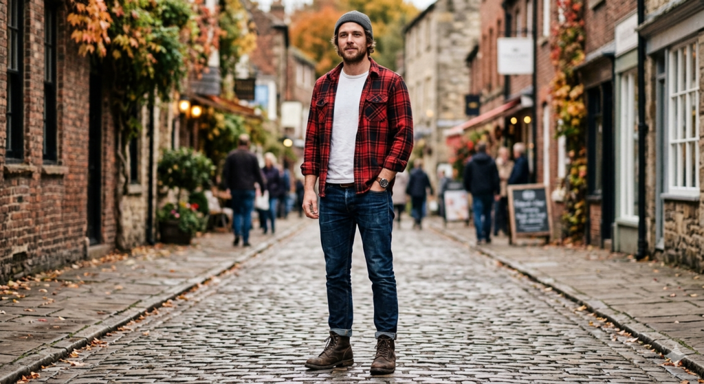 The lumberjack reissued. Red plaid flannel worn open over a white tee, slim dark jeans, and brown or tan leather work boots is one of the most iconic casual men’s looks for a reason — it works.