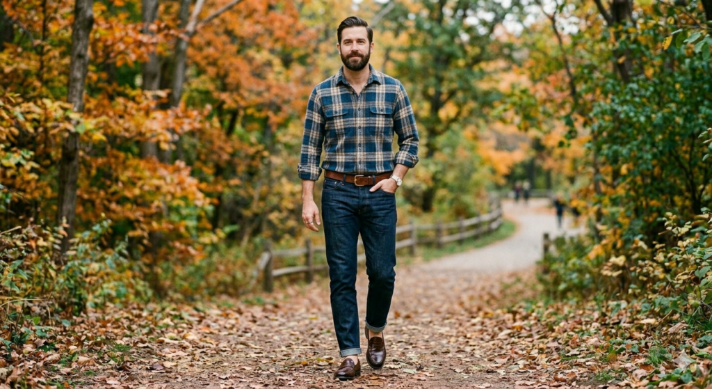 Heritage workwear. Raw or selvedge denim with a flannel shirt, leather boots, and a thick leather belt is a heritage menswear combination with real credibility. The stiffness of raw denim contrasts beautifully with the soft texture of brushed flannel. Choose a flannel in burgundy, forest green, or charcoal for the strongest workwear palette. Roll the denim hem slightly above the boot shaft.