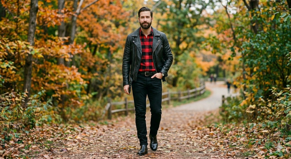 Rock-casual energy. Layering a flannel beneath a black leather biker jacket is a rock-and-roll styling move that happens to be very wearable. The flannel’s soft, relaxed texture contrasts with the hardness of leather in a way that makes both pieces look better. Slim or skinny black jeans and black Chelsea boots complete the dark, edge-adjacent palette. Red or burgundy flannel works best here — it pops against the black without disrupting the mood.