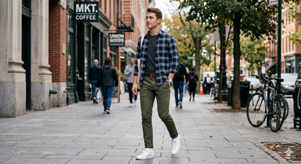 Flannel meets athleisure. A relaxed flannel overshirt worn open over a tee, with slim-fit joggers and chunky trainers, brings a streetwear sensibility to a classic workwear garment. It works because both elements — the flannel and the jogger — share a relaxed, casual register. Keep the flannel in a darker, less “outdoorsy” shade (charcoal, dark navy, black check) for the most believable streetwear version of this look.