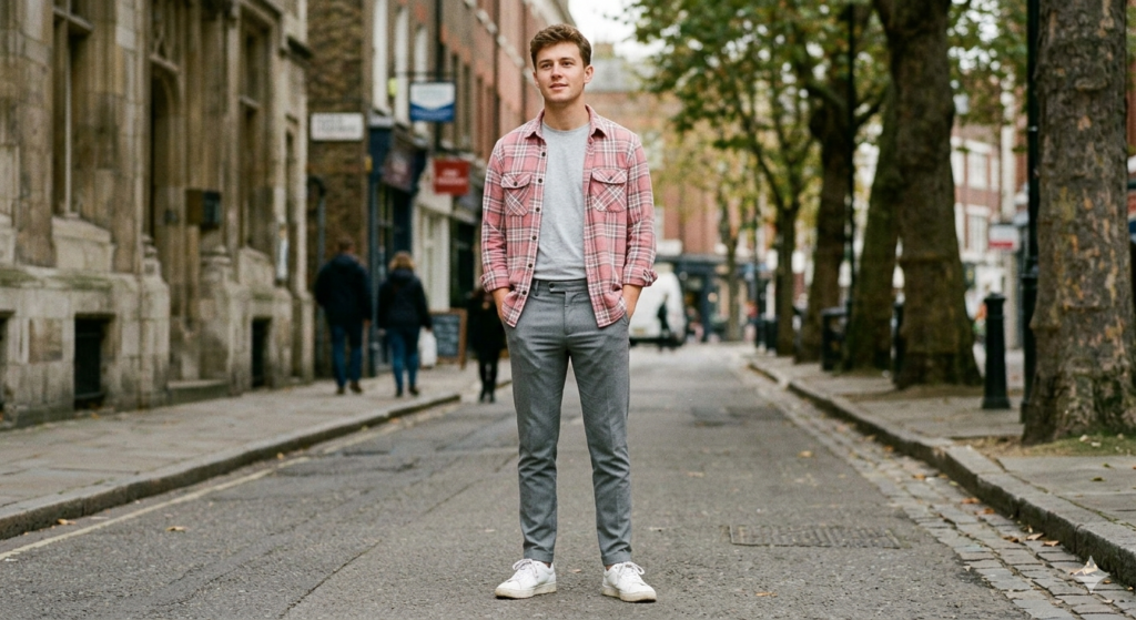 The unexpected colour move. Most men reach for red, blue, or green flannels — but a pale pink or muted lilac flannel worn over a white tee with grey slim trousers and white trainers is a fresh, confident take that reads as more fashion-forward than the standard earthy palette. The key is keeping the flannel in a softer, washed-out shade — this isn’t about wearing a bright pink shirt, it’s about using a muted, unexpected colour intentionally.