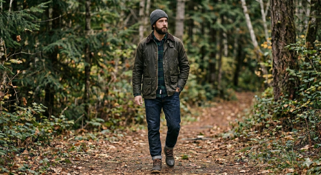 Styling tip: A wax jacket works best in olive, tan, or dark navy. Matching the jacket to one of the colours in your flannel’s check creates an intentional palette.
