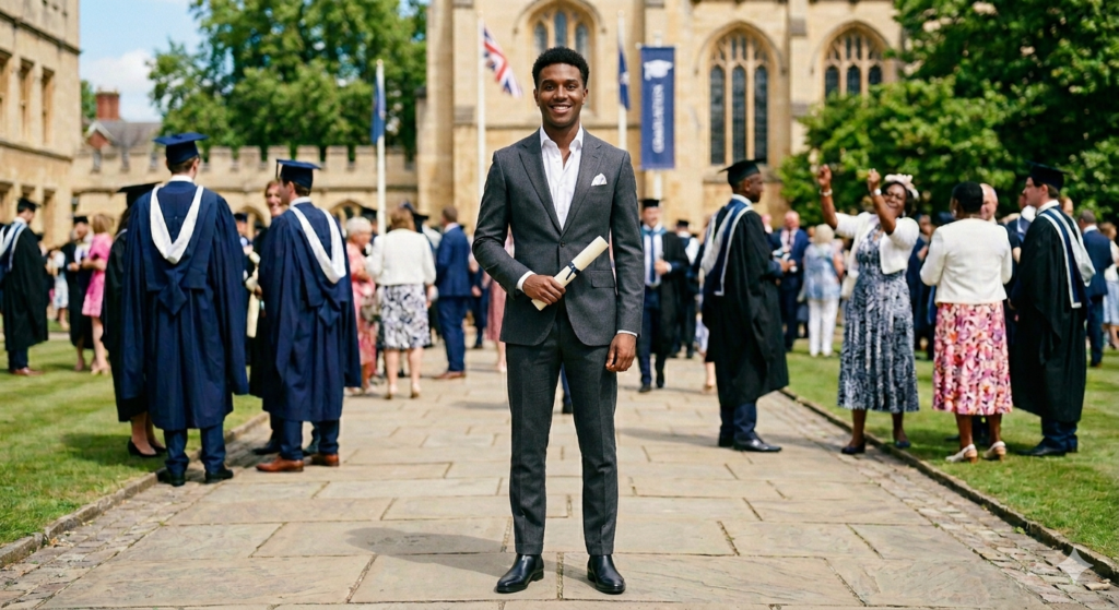 - Wearing a suit that does not fit. A poorly fitting suit on graduation day will be visible in every photograph taken. Shoulders drooping, chest pulling, trousers pooling — none of these are fixable after the ceremony. Fit is the single most important investment you can make.