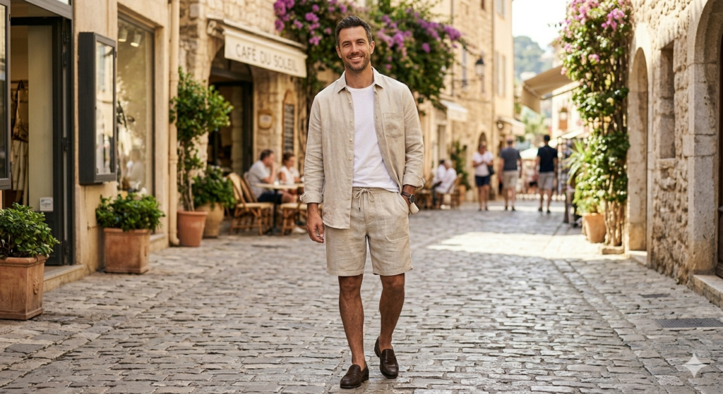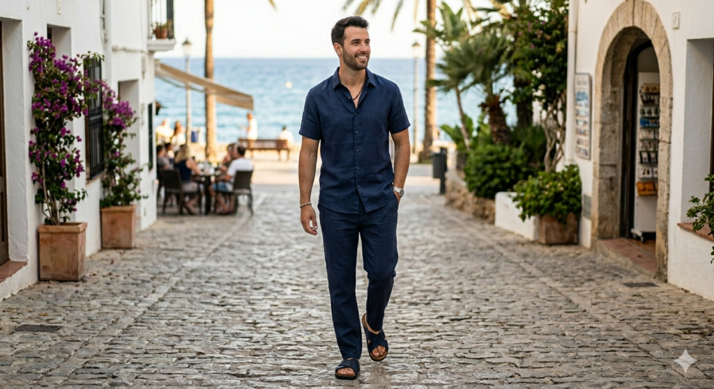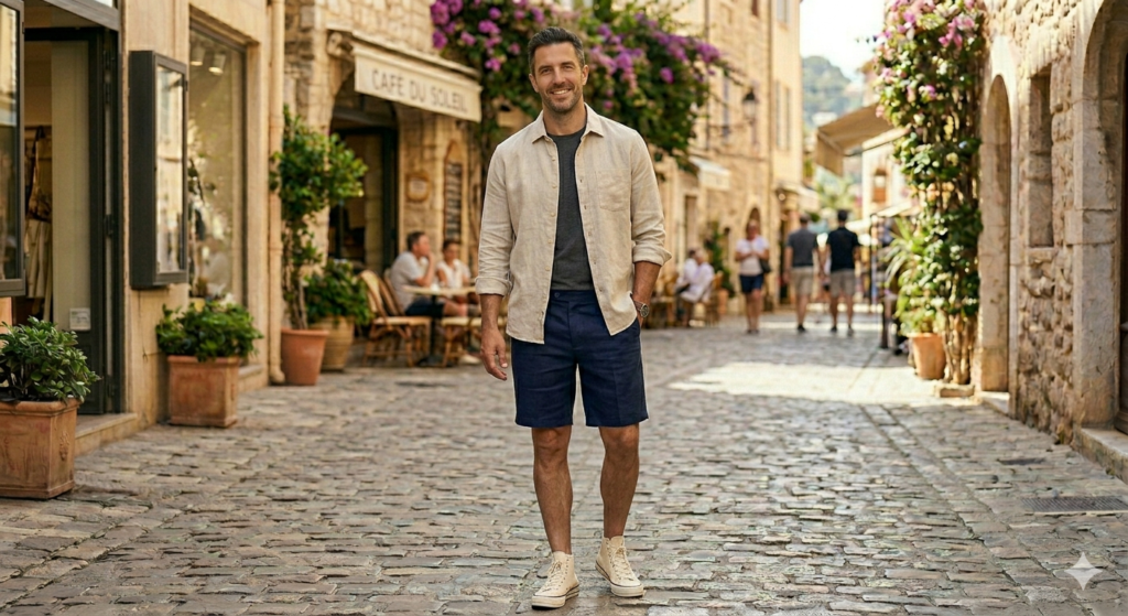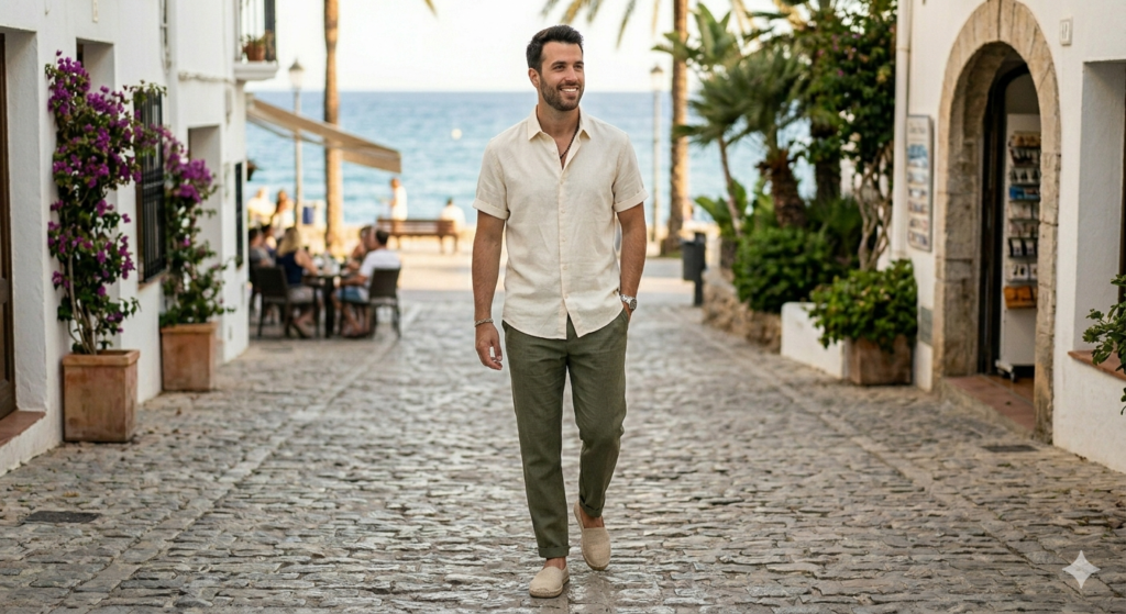 Wear a linen shirt open like a light overshirt over a fitted plain crew-neck tee, paired with matching linen shorts. This adds subtle layering and visual depth without adding heat. It’s a streetwear-meets-resort look that photographs brilliantly and wears comfortably for hours.