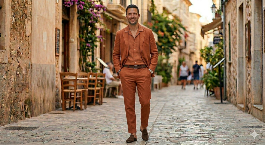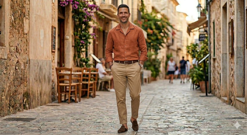 Terracotta is one of the most flattering warm-toned colours for men in summer — it works across a wide range of skin tones and photographs beautifully. A terracotta linen shirt with white or cream chinos creates a warm, confident colour story that stands out from the sea of navy and beige outfits without being flashy.