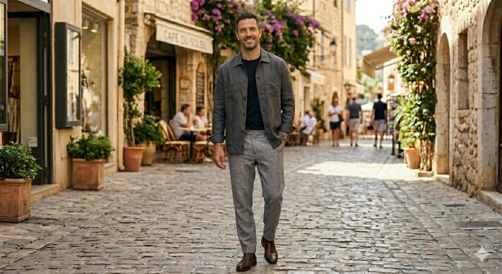 Grey linen trousers with a fitted black tee is the understated, minimal approach to linen dressing. It’s less “holiday” and more “cool city summer” — ideal for urban settings where you want to look considered without the tropical resort energy. Add black or dark brown Chelsea boots for a confident edge.