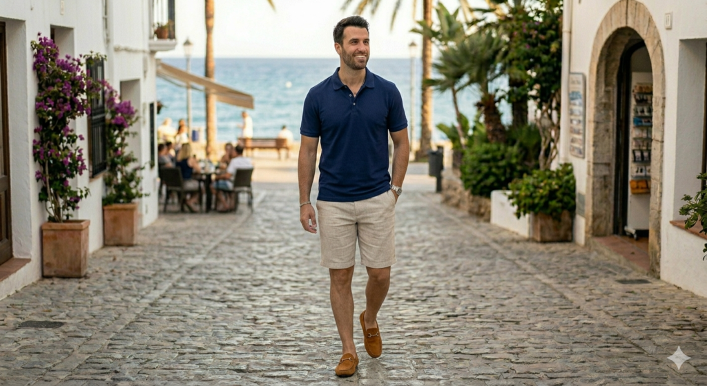 Styling tip: Stick to neutral shorts — beige, olive, or navy work best. Avoid busy prints unless you’re fully committing to a resort aesthetic.