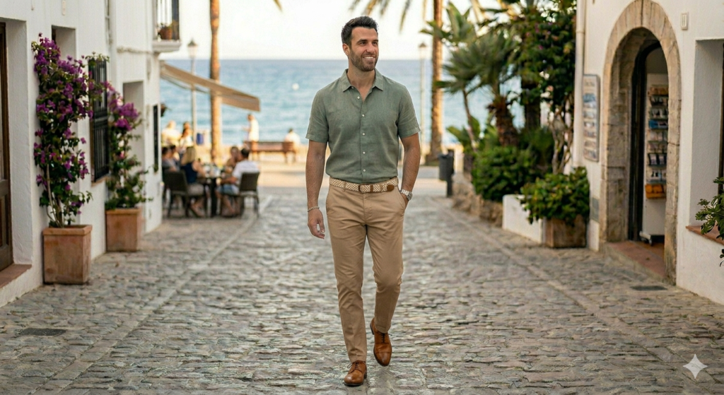 Styling tip: Tan leather sandals, a woven belt, and a minimal gold watch are perfect. This look photographs exceptionally well outdoors — especially near the ocean or against green surroundings.