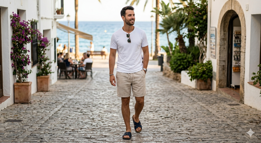 For days when the temperature is genuinely brutal, swap trousers for mid-length linen shorts. Pair them with a fitted white tee and leather or raffia slides for a look that’s minimal but intentional. This is your go-to beach-to-café outfit — effortless, cool, and easy to pull off.