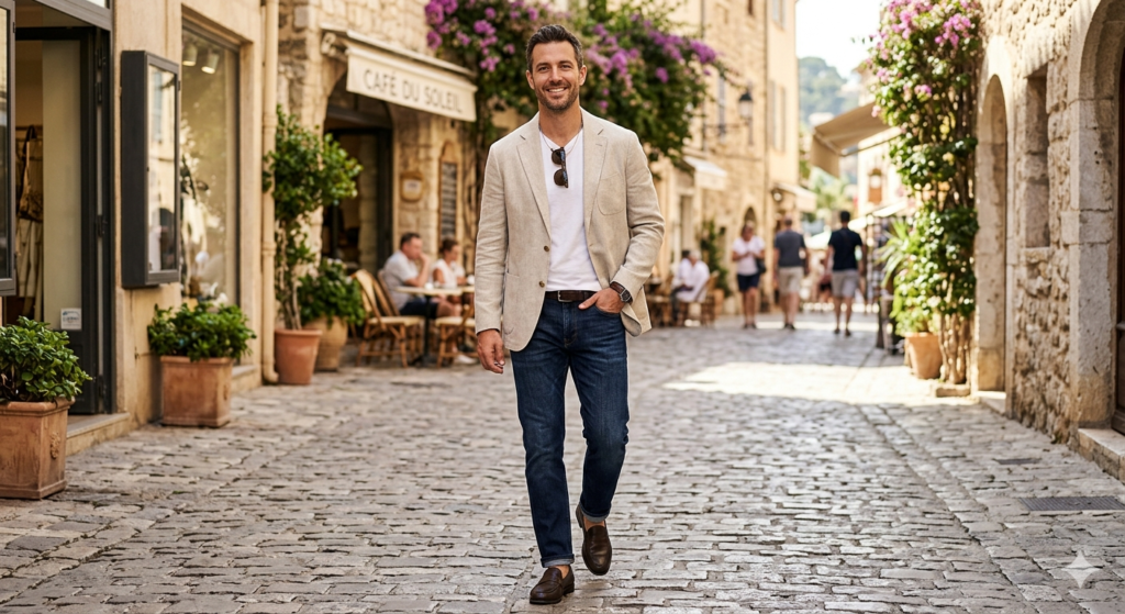 Wearing a linen blazer and linen trousers in tonal but slightly different shades — think a sand blazer with camel trousers — creates a near-suit effect that reads incredibly sophisticated. This is the answer to “what do I wear to a summer smart-casual event?” without resorting to a full suit in the heat.