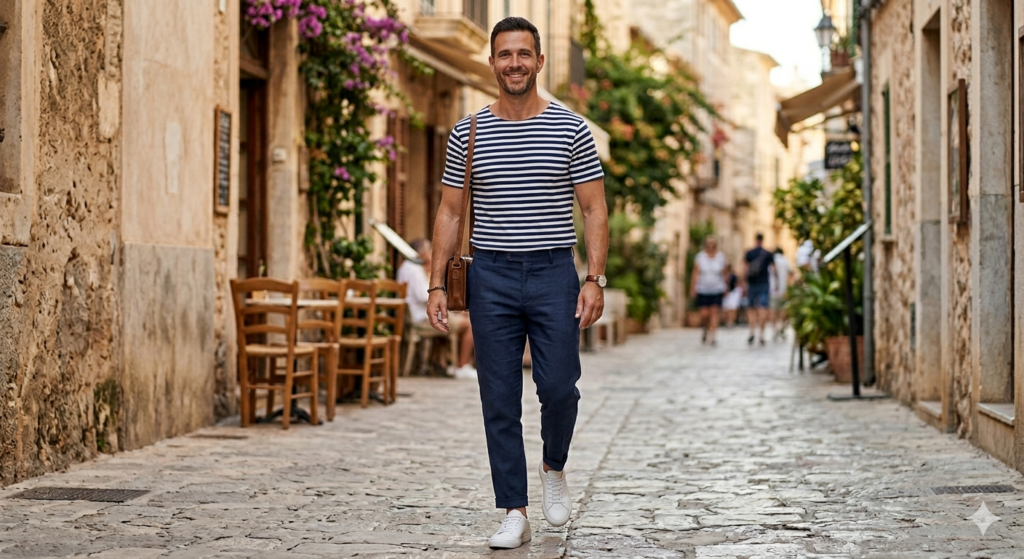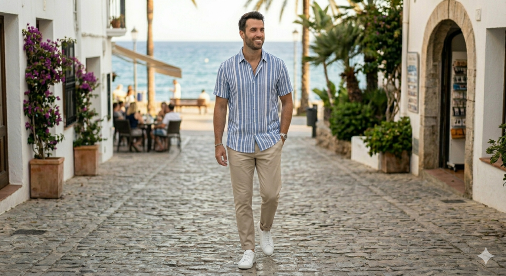 A vertical-stripe linen shirt in navy, red, or earthy tones adds personality without going overboard. Pair it with beige or stone chinos and white sneakers for a look that’s casual but coordinated — ideal for a summer weekend exploring a new city, a beach town market, or a laid-back brunch.