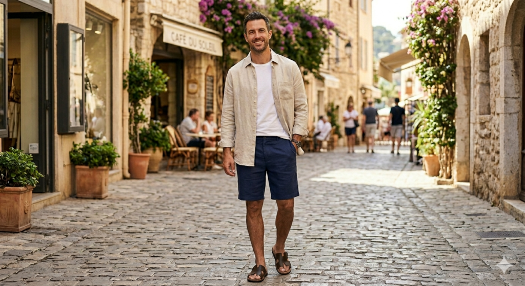 Upgrade your shorts game by pairing them with a properly fitted linen shirt — tucked in. The tuck makes the key difference here: it elevates the shorts from casual to smart casual almost instantly. Choose tailored shorts (not board shorts) in a neutral tone and finish with structured leather sandals. This look suits summer lunches, outdoor events, and travel days.