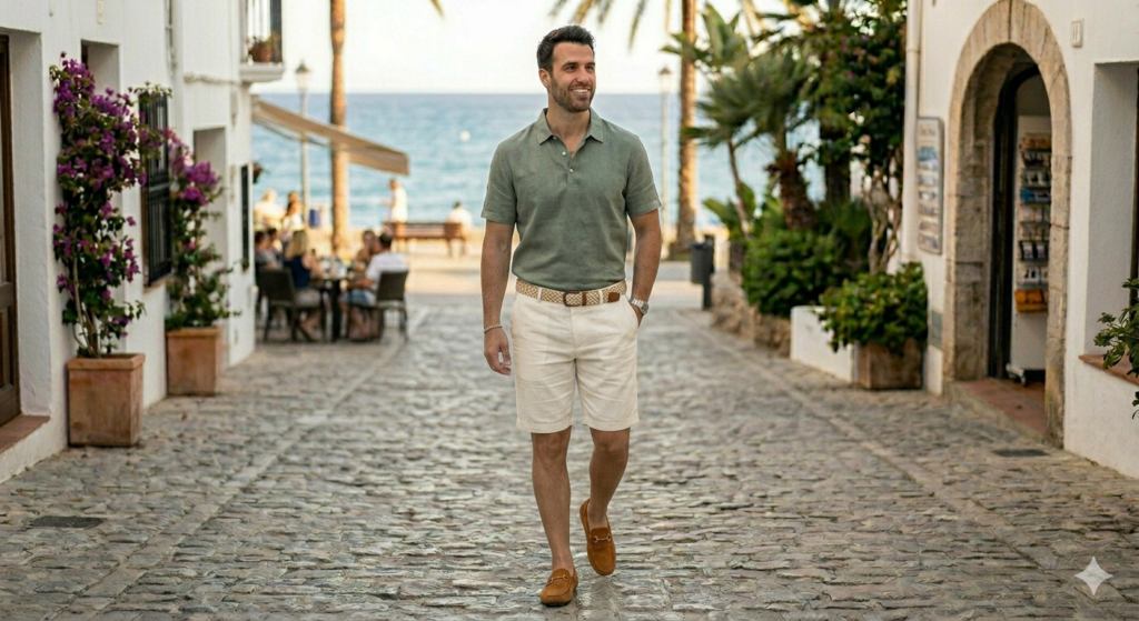 For a preppy-meets-resort aesthetic, pair tailored linen shorts with a fine-knit polo in a coordinating colour. This look bridges smart and casual perfectly and is ideal for yacht days, summer clubs, or any occasion where you want to look intentionally put-together without over-dressing.