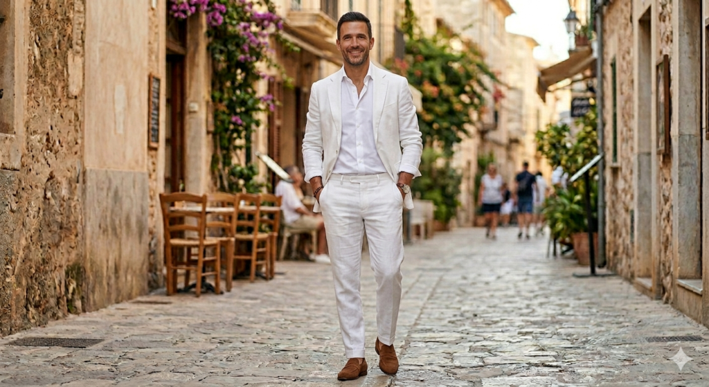 A white or off-white linen suit without a tie is one of the most striking outfits a man can wear in summer. It reads formal enough for a summer wedding or garden party, but the linen fabric and open collar keep it from feeling stuffy. Think 1920s colonial glamour updated for modern sensibilities.