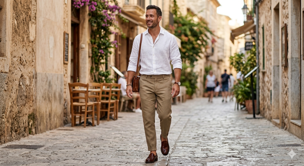 This is the quintessential summer smart-casual outfit — and for good reason. A crisp white linen shirt (leave the top two buttons open) paired with well-fitted khaki chinos strikes the perfect balance between polished and relaxed. It works for rooftop bars, outdoor dinners, and even casual Fridays at the office.