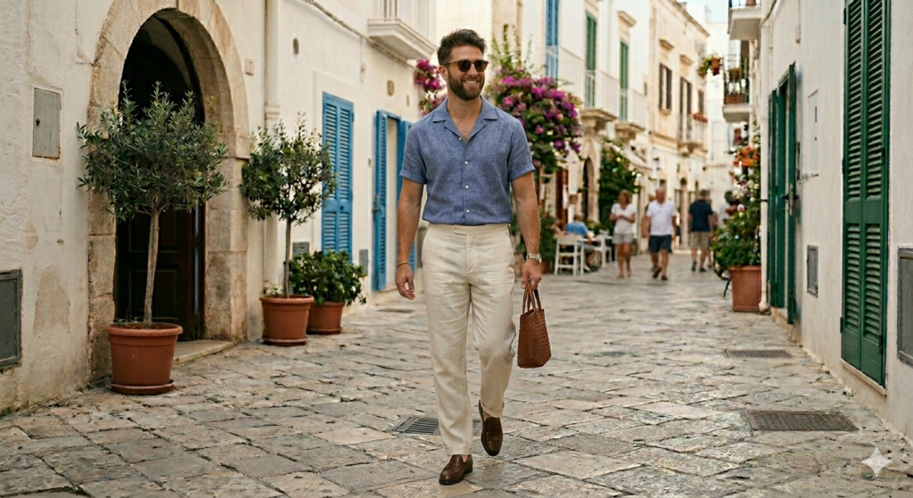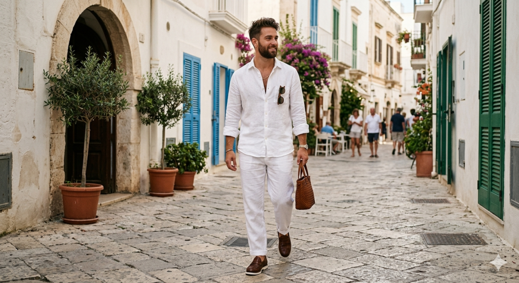 The Outfit: Matching linen shirt + linen trousers in the same colour (white, ecru, sage, or light blue) + leather sandals or loafers