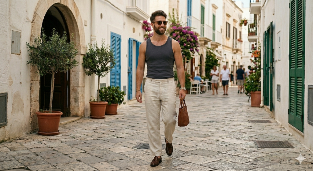 This is a European summer outfit in its purest form. A fitted tank tucked into relaxed linen trousers creates a clean contrast between a tight top and a flowing bottom — a silhouette that works particularly well in the heat because the loose trousers move with you.