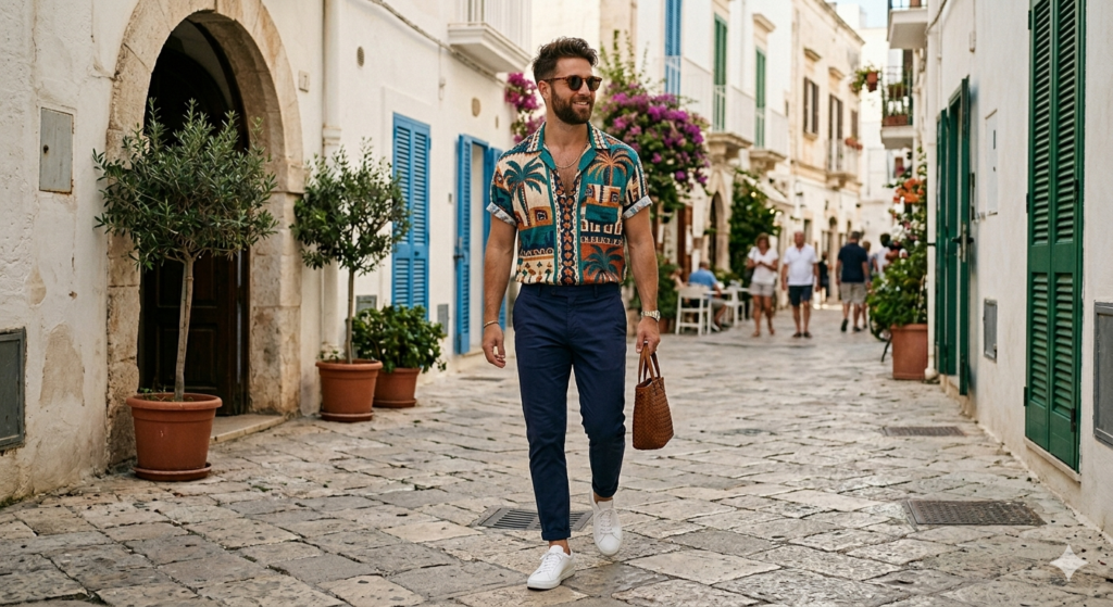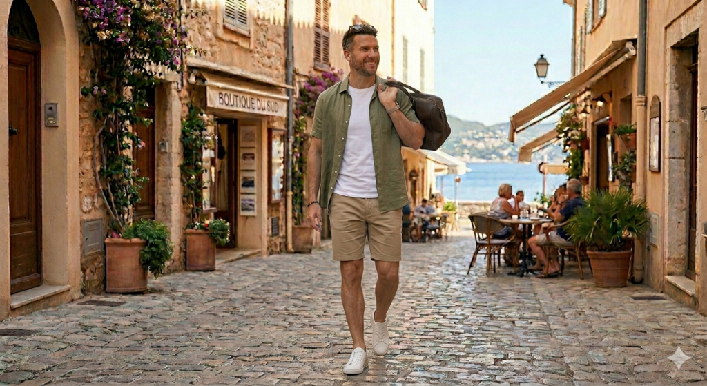 Q: What colours work best for men’s summer outfits? White, ecru, stone, sand, navy, sage green, light blue, and terracotta are the colours that dominate men’s summer dressing for good reason — they’re cool, easy to combine, and photograph brilliantly in natural light. Bright or neon colours can work in very specific contexts (a bold resort shirt, printed swim shorts) but should generally be one accent piece in an otherwise neutral outfit, not the whole palette.