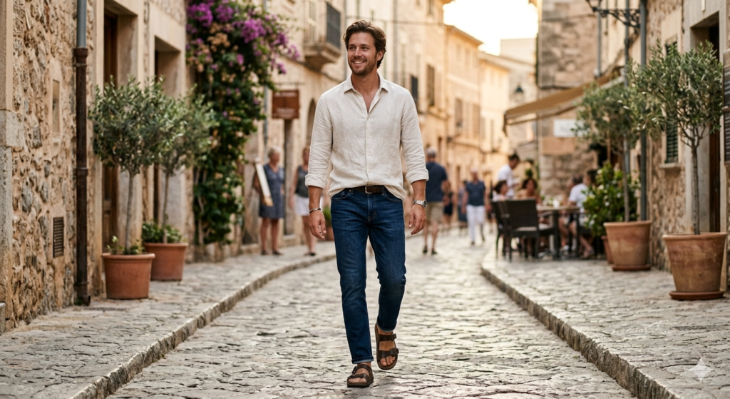 Leave two or three shirt buttons open at the collar. Roll the shirt sleeves up to the elbow — it’s both practical and stylish. Leather sandals (not flip-flops — actual structured leather sandals) complete the Mediterranean-casual look.